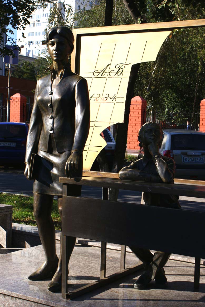 Близкие каждому образы первой учительницы у доски и ученика, сидящего за партой, выполненные в бронзе, в 2008 году появились на Народном бульваре напротив здания 9-ой гимназии накануне Дня учителя. Неожиданный подарок педагогическому сообществу ко Дню учителя подготовили харьковский скульптор Тарас Костенко и архитектор Сергей Сидоров.